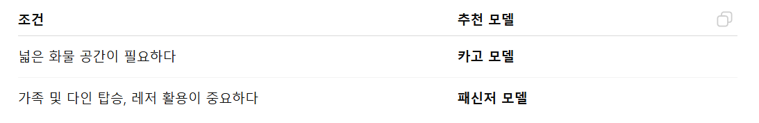 2열 탑승공간도 중요하고 레저 활동도 중요하다면 패신져 모델을 선택하시면 좋을 것 같습니다.